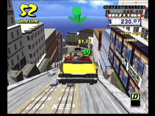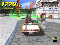 If you agree with everything that I have said thus far (or even a little bit) then you are probably dying to find out about this new game Crazy Taxi. It's simple, control-friendly and just about the most entertaining game I have played. You take on the role of one of four cab drivers by the names of Axel, B.D. Joe, Gus, or Gena. There is basically little differences between each of them. One glaring difference is the cabs. All the cabs looked like painted up classic cars especially Gus's 1955 hog. The minor difference I could tell was the speed. Gena's ride seemed to get up in the higher speedometer digits than the fellas. After selecting your driver it is right off into some adrenaline pumping, rubber burning, high flying, car dodging fun through two cities that are chuck full of crazy jumps, pedestrians, speeding cars, and eager people waiting for a ride to their destination.