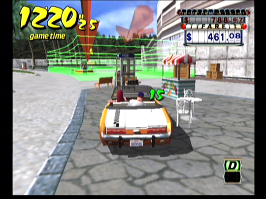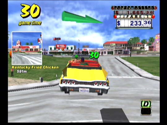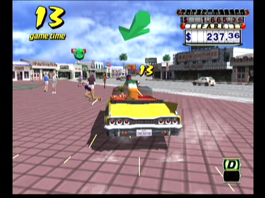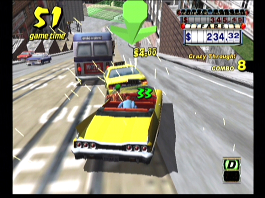 This is where you all will not believe me. After you hop in your car go towards a person waving you down. The people that need rides have large arrows above their head and circles around them. Stop within the circles to pick them up. The color of the arrow above each person determines how far they want to go. A RED arrow says to the cabbie that that person wants to go a very short distance. Colors start to fade all the way to green. If you wish to drive a much farther distance through the streets then pick up a GREEN-arrowed person. Once you pick someone up a little picture pops up depicting their destination. With the help of a large arrow on the top of the screen, you should find your way pretty easy. Also the passenger will yell out "TAKE A LEFT!" or "GO STRAIGHT". When the spot of departure is in the distance you will be able to see a huge green wall surrounding it. Stop somewhere inside the green area and your passenger will jump out and give you their fare. Sounds simple doesn't it? Well it is, but you have no idea how much fun it is! I can not describe my feelings when I play this game but I know for sure that it will never get old.
