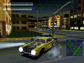 Probably 50% of the back-bone to Driver is the Undercover Mode. Upon starting this mode you take on the role of Tanner, an undercover cop as a driver-for-hire trying to shutdown the powerful crime ring spanning four cities. Tanner starts out in Miami but eventually make it to San Francisco, Los Angeles, and finally New York City. His answering machine is what Tanner listens to in-between missions and you must decide what mission that you feel like doing. After deciding the mission there is a video sequence, like a short fly through a part of the city, and the mission starts. By a black area showing vaguely where to go you must make it there in time. Sometimes missions are not timed and you are able to take many different ways. But when moving to different cities I found that I had to play a mission a couple of times till I became familiar with the city. The reason for this is because the cities are HUGE. There are many, many paths to take but the shortest route is usually the most favorable. Detail is something that Reflections took to heart and did a great job portraying each city. There are street cones, signs, cafe tables, and boxes that can all be destroyed by the car. This makes the replay at the end of each level look really exciting. Pedestrians are sprawled out everywhere but I could never manage to hit one (my precious, angel ways) because that run out of the way. What is great is seeing those pedestrians sitting at a cafe table eating and me come through 50 going 90 and the pedestrians run out of the way at the last minute just as I crash into the table. Also there are working street lights and weather changes (rain actually changes road conditions). You may start a mission in bright sunlight but end at night. Not only are the cities detailed but the cars as well. Damage to the car looks very realistic. Tail lights turn off when they shatter after slamming in reverse into something. Also the other pedestrian cars have damage.