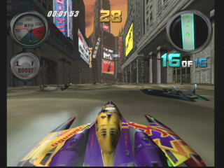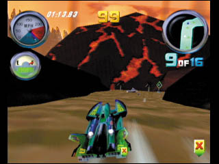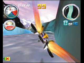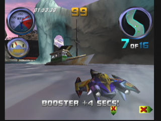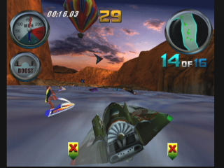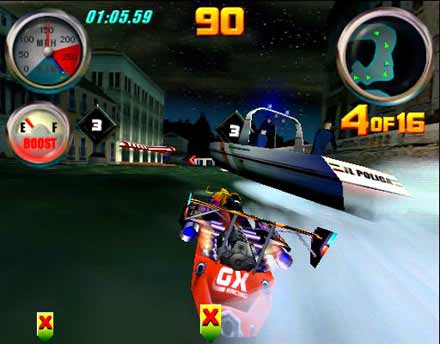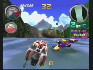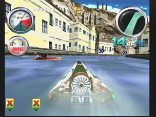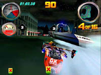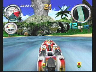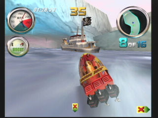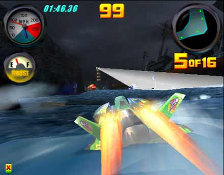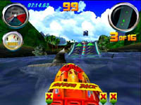 Track design for the first nine courses are excellent and very original. There are jumps galore and speed boosts all over the water that add four or nine second boosts to your boost meter. Along with the jumps there are huge waterfall leaps, bridge dives, and volcano bounds. Each track has its own special characteristic that separates itself from the rest. Tracks include Artic Circle, the Far East, Venice Canals, Ship Graveyard, Lost Island, Lake Powell, Thunder Park, and the Greek Isles. Possibly the greatest course in the game New York Disaster. A giant meteor hit the city and flooded New York streets and buildings. This recipe makes a perfect backdrop for a boat race. There are street signs floating in the water, street and building rubble on the banks, and other various objects floating about.