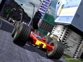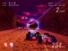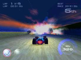 Psygnosis, creators of many average racers, have outdone themselves with this one. Rollcage is a futuristic, fast-paced, and adrenaline pumping racer. This does not just have Gran Turismo's Mazda or Aston Martin cars. This does not just have Monster Truck Madness' monster trucks. This does not just have Mario Kart 64's (for those who have played it) karts. No it does not have just one of these but it does have a mixture of every single one. The vehicles in Rollcage, for one, look very slick. As slick as the Aston Martins, or any car for that matter, in Gran Turismo. Not only do they look slick they also are compact with four huge wheels on the body of the vehicles. These wheels are bigger then the actual body so this enables the vehicles to drive on either side (very handy). Finally the vehicles are like Mario Kart 64 considering the fact that they are able to pick up weapons sprawled out on the tracks and use them against their opponent drivers. Upon starting Rollcage you have the opportunity to chose between many options found in most of the racing games. There is a practice mode where you select a vehicle and race on the same track. While doing practicing you may change your vehicle at any time by just pressing start, selecting change driver, and the vehicle you are driving just changes into the one you have just selected. This is helpful because you have to find the right type of vehicle that you like. The vehicles differ in feel so much; finding the right vehicle might take a while. Learning how to drive the vehicles takes some time and some patience. After you practice a little bit with these new types of vehicles, have found the one that you feel comfortable with, and feel confident about your skills then it is time to move on to League Mode. Here you start out on a circuit with three tracks and each track has three laps. The first tracks you race are pretty easy but get progressively harder. Rollcage's track design is perfect! Each track has fully destructible buildings aligning the outer rim of the track at parts and objects in the middle of the road that can also be destroyed. You might be traveling way too fast and crash into a building causing it to come to the ground in a fiery explosion or just ram into a huge crate in the middle of the road. Luckily these monsters that I call vehicles are fully indestructible. If they were not indestructible most of us would have a hell of a time getting around these tracks once. Also on the roads are boost marks that if you drive over them cause your car to have a slight boost of speed. If there are a few in a row and you hit all of them then your vehicle will go so fast that you can see the heat on the your hood begin to glow. This reminds me of astronauts re-entering the earth's atmosphere getting ready for splash down and the incinerating heat that it produces as it gets faster and faster. This just goes to show how much detail was placed into this game. Another detail about the tracks in Rollcage is that you can race upside down. If you enter a tunnel and going fast enough you can ride up along the wall and just drive up it till you reach the top and you are now racing upside down. Most of the time the ceiling will have boosts on them or power-ups on them so it is very useful to learn how to drive upside-down. Some other modes include a Time Trial Mode and Multiplayer levels that I will get into later. Speaking of power-ups this game has some interesting and unique power-ups. Just like in many games there are the missles and turbo boosts. Missles are probably the most abundant resource in Rollcage. There are many different types of missles like the homing missle, which targets the nearest building and destroys it which cause debris to get in the way. Or if you press UP and shoot the homing missle it will target the nearest enemy and hit him/her. The Leader Missle is another type of homing missle but it targets the vehicle that is in first place. Be sure not to shoot one of these if you are in first place because it will come back to haunt you. The final missle is the Driller Missle which "drills" through numerous targets until it hits something it cannot destroy. The turbo boosts, in my opinion, are the only useless power-up there is and the reason for this is because there is not a good place to use the boosts. There are no straightaways and if you use one you usually end up going to fast and crashing. This lead me to lose many races because I used it at the wrong time. Some of the more odd power-ups are the Wormhole, Ice Sheet, and Time Warp. The Wormhole will take a vehicle in front of you and place it behind your vehicle. If you use the Ice Sheet power-up it will cause enemys around you to lose 80% of their tire friction causing them to spin out easier. Finally the Time Warp is a power-up that, when used, causes all the opponents engines to turn off and their speed cut drastically. The League Mode will keep you busy for a while considering it gets extremely difficult and frustrating. But the multiplayer in Rollcage will keep you busy for much longer. You and a friend can race either against each other on one of the many tracks or can go head to head in one of the 4 deathmatch levels. When you race together on a track it is basically the same as the League mode but with 2 people instead of 6. Power-ups, boosts, buildings, everything is the same. Now as for the deathmatch arenas (that you can only get by placing first in every race in each league, or just by entering the password MAXCHEAT) it is you and a friend pitted against each other in a fight to the death. Well not really considering the vehicles are indestructible. Each of you will rack up points depending on different things like falling off the arena or getting blasted by a rocket. Each time you hit you opponent you receive a point. The game does not end till a person reaches a certain point. This reminded me once again of Mario Kart 64 for those who have played that games 