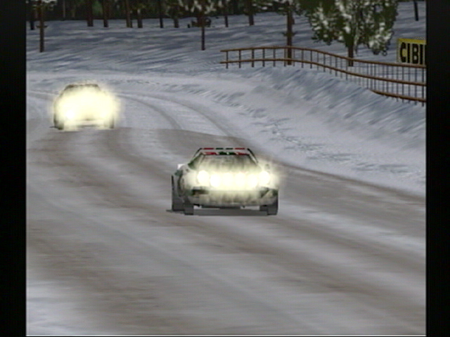 Not only do the tracks themselves have excellent graphics but so do the cars that drive on them. Decals, Manufacturers, even the replacement tire in the back seat of the car can all be read clearly. Tail and head lights come on and off and rear-view mirrors reflect what is behind them. As the car moves through more and more mud, snow, and water, build-up can be seen on the car's tires and it affects the way the car handles. After repeatedly running through puddles of mud eventually the car will need a good wash-down because of the dirt mounded on the side of the car and windshield. Yeah that's right, if you decide to race with the hood viewpoint eventually it will become blurry and hard to see at times because of the splashing of mud all over it. Talk about realism! In some previous games I have played collisions between cars looked unnatural but in Rally 2 it could not be more realistic. Techniques like bump-spins and side-swipes bounce the cars around in true-to-life directions.