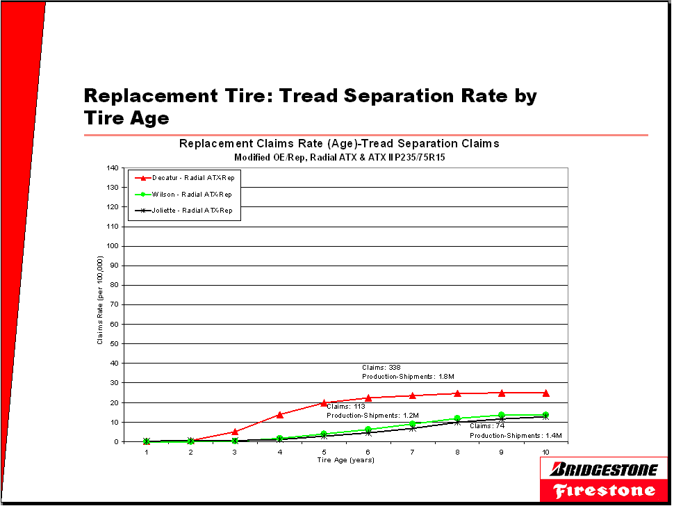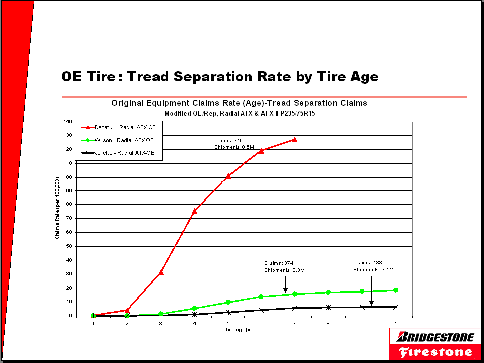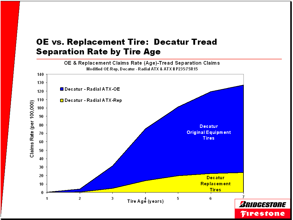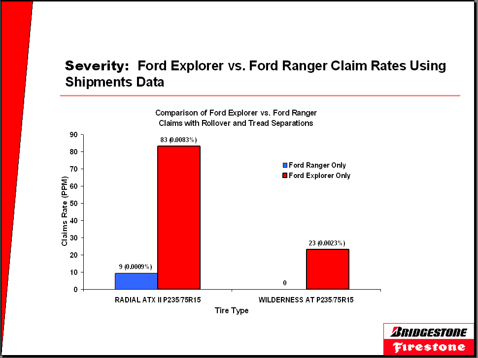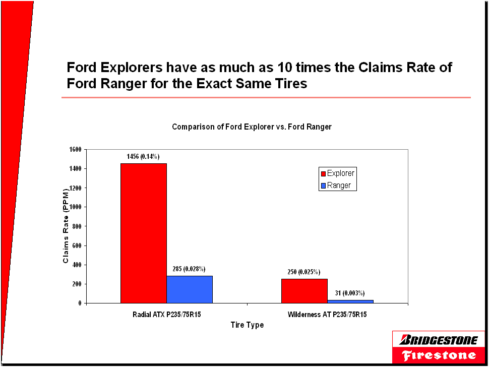 Bridgestone provides data that says that "its not the tires but the Explorers"Bridgestone:"Our analysis suggests that there is a significant safety concern with a substantial segment of Ford Explorers. We have told Ford of our concerns. They have steadfastly refused to acknowledge those concerns. We have always said that in order to insure the safety of the driving public, it is crucial that there be a true sharing of information concerning the vehicle as well as the tires. Ford simply is not willing to do that," Lampe said. "We believe they are attempting to divert scrutiny of their vehicle by casting doubt on the quality of Firestone tires. The tires are safe, and as we have said before, when we have a problem, we will acknowledge that problem and fix it. We expect Ford to do the same."