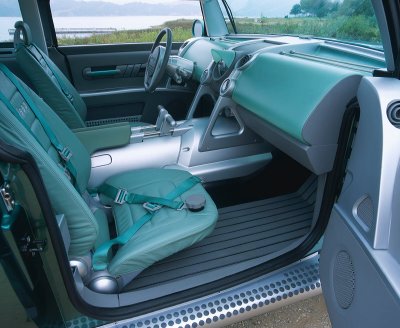The spacious interior blends colors of aqua and silver, providing an honest and mechanical appearance. Translucent plastics allow for a new approach to Jeep design while remaining true to the brand's legendary versatility.