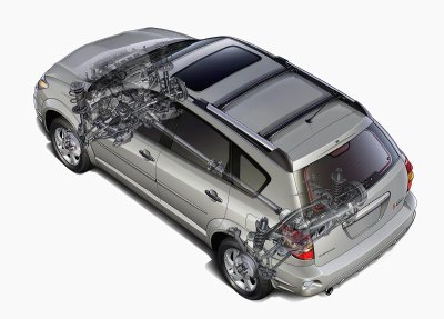 All-wheel drive is available, and an antilock brake system (ABS) is standard on AWD and GT models and available on the base vehicle. According to Vehicle Line Executive Jerry Gillespie, Vibe’s flexibility is aided by its interior spaciousness. “The Vibe is built upon a highly efficient body architecture, which offers cavernous interior and cargo space comparable to larger SUVs.” It features a large safety cage and crumple zones, with the frame and body panels constructed of high-strength steel designed to absorb energy in a crash and resist passenger-compartment intrusion.
