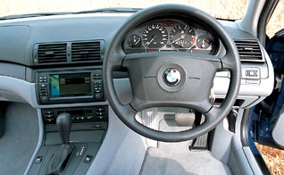 Although the plain gray interior, black dash and center console gave the test car an austere look, the "Young Line" décor pack, featuring a choice of bright glossy red or blue interior trim panels, is available to add flair. The smallest Beemer also boasts the usual high standard of ergonomics. The driving position can be adjusted for any frame, and there's plenty of room for even the tallest individuals in the front. In addition, the steering wheel is adjustable for both reach and rake to ensure a perfect fit. For a smallish car, the rear is not bad either—at worst, lanky drivers may need to splay their legs. Being a hatchback, the 316ti's rear seats fold down to create a large 1,100-liter storage area for camping or that double-income shopping spree. Despite being at the less-expensive end of BMW's range, the test car was fitted with a few little luxuries. The gear lever and park brake were leather-covered, though this doesn't extend to the steering wheel. An increasingly common optional DVD-driven audio/navigation/TV unit neatly filled a gap in the center console, replacing the standard radio/MD player. A glass-panel sunroof was another extra-cost feature. Regardless of price, it's safety first these days and the full array of front, side and head airbags are standard.