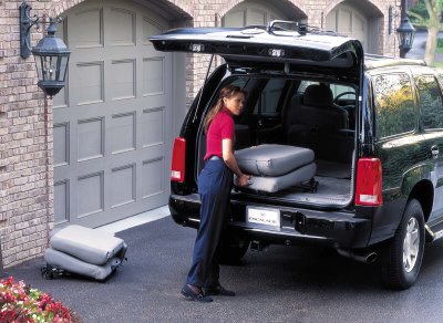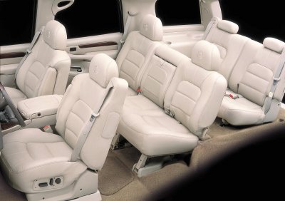 Cadillac has certainly done a good job with the Escalade’s aesthetics. It has a very rugged, yet classy, exterior. Mine came in gleaming ‘sable’ black, with huge P265 70R17 all-season, steel-belted radials on 17”, 7-spoke milled finish aluminum wheels with crest and shield, protective body-colour cladding, chrome roof rack and imposing chrome front grill and body-colour bumper. The interior, for the most part, continues this classy theme, with Nuance leather seating, wood and chrome trim. 10-way power heated front seats with 2-position memory, heated and reclineable 2nd row seats, and a 3rd, 50/50 split, removable row, which folds down with ease, mean up to 7 or 8 can be transported in comfort. However, what’s with the bog-standard, crappy plastic dash/radio controls??? Given that I’ve driven a number of GM vehicles, I find it hard to believe they would offer the same facia in a luxury $54,000 vehicle, as they do to a first-time, economy sedan customer. The ‘brushed chrome’ effect on the dials and classy black/white illumination is fine, but why not continue that theme throughout? Cutting corners, perhaps? I now understand why Shaquille O’Neal et al get their SUVs thoroughly detailed, so as to avoid such unpleasantries!