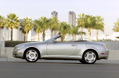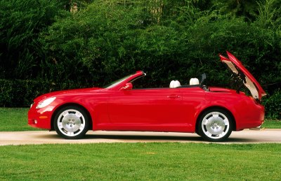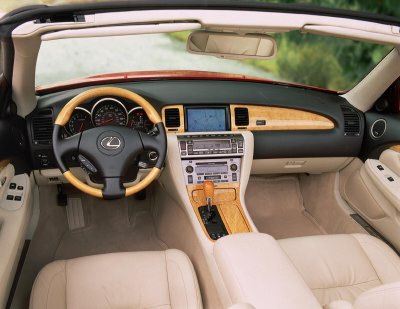 Now, whilst some might not find the SC430’s exterior styling to their liking, they’d be hard pressed to find much wrong with its interior details. Simply beautiful, with no crappy touches at all! Amazing – no plastic trim, no fake wood in sight – just Nappa leather, real wood trim and brushed chrome accents. The driver center is well laid out, and clear to read and operate, with dual-zone ‘Intuitive Climate Control’, that automatically adjusts according to sun position, speed and roof up or down driving conditions, DVD navigation system and a Mark Levinson boom box, totaling 9-speakers and 240-watts of premium sound and 6-CD auto changer. Yes, you too can be the obnoxious convertible driver with the blaring stereo if you so desire. Convenience features also include memory seats, homelink universal transceiver, electrochromic inside and outside mirrors, and heated outside mirrors.