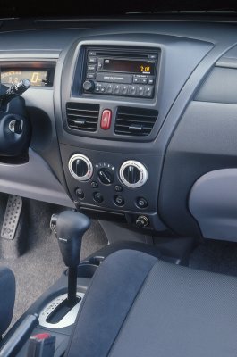 COMFORT: That tall roofline makes perfect sense from the inside. There is plenty of headroom, front and rear. The sedan's rear seat has more head and leg room than is found in some midsized cars. Although the width makes it best for two people, a low central tunnel does help any rear center passenger. The interior design blends well with the exterior, with interesting geometric shapes and good visibility. Thanks to the high roof, the seating position is comfortably upright and the high eyepoint gives a good view of the road. Forward vision is also improved by a low instrument panel, allowed in part by a digital instrument display. Is it 80s-retro or is it futuristic? Doesn't matter, as the digital speedometer and bar-graph tach are easily visible, even through polarized sunglasses. The symmetric dashboard places the audio and climate controls in a central pod. Standard equipment levels are high - the Aerio S has air conditioning, an AM/FM/CD stereo, power windows and mirrors, a tilt-adjustable steering wheel, and split folding rear seat. The GS adds power locks with remote keyless entry, adjustable driver's seat cushion height, cruise control, a storage tray under the front passenger seat, and more useful features. The small rear deck may imply a small trunk, but don't be fooled. The Aerio sedan has one of the largest trunks in the compact class.