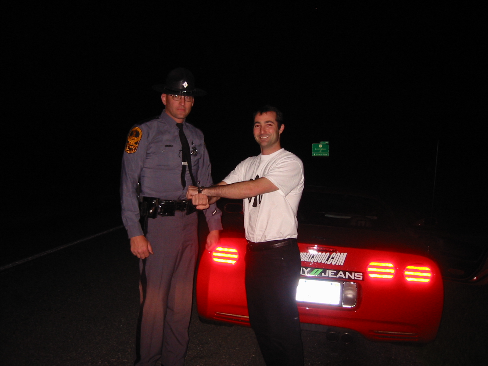 The previous Troopers, one from Virginia and the other Tennessee, had been polite, courteous and professional: no guns, no glory, just going about their revenue-collecting business. Other Gumballers hadn’t faired so well. A Ferrari convoy, including two 550’s a 550 Barchetta and a 360, were pulled over on the New Jersey turnpike. Stopped for doing 75, they got out of the cars to get their documents, (as you do in the UK) and were duly threatened with a handgun, imprisonment and the cars being impounding. “Your car’s got flames cumin’ out the back – we don’t need that shit on my highway”, said the officer. He let them off with a ticket, as did many cops that night, as the Gumballers blazed a trail of speeding tickets through seven states, filling the assorted officers’ pockets along the way. DC’s train station was grand enough, and after a chicken sandwich and some good stories we set off in convoy, with a new AMG SL55, Diablo, Viper and a glorious-sounding black Daytona. Running at 2am, at a very respectable and highly reserved 83mph, I was zapped by the Virginia radar and pulled over, the others allowed to go on, since I was the lead car. Having witnessed countless Gumball radar casualties, I opted to leave the highway at that point and take the road less traveled. Route 11 was, of course, deserted, just my co-pilot Bruce and I in the Z06, an AMG E55, some truckers and no cops; they were all on the verges off I81, radar guns at the ready. This allowed us the chance to let the 405 horses run a little. The old Chevy V8 engine has now seen so many reiterations that one feels it could power a submarine. In any gear, at almost any revs, there is instant power. 90mph in 6th gear has the engine running at only 2500 revs, but if you want the horses to work for you, forget 6th; it’s really an overdrive and isn’t suitable for high speed acceleration. Out in the darkness of the Appalachian mountains, we saw 130, 140 and 150mph, the car stable apart from slight bonnet shake, initially unnerving but harmless, the V8 roaring upfront, the four titanium exhausts leaving vapor trails in our wake. After twelve hours at the wheel, Bruce took over at 6am, with 400 miles to go ‘til Nashville. By this stage, Virginia had notified it’s brothers-in-arms in Tennessee that these “Cannonballers” where heading their way and the whole state scrambled to do some piggybank filling. Bruce was doing well until he ran up the backside of an undercover car. “Well, it sure ain’t everyday I have some gun coming up behind me at EIGHTY FIVE MILES AN HOUR!” I nearly dropped the video camera I was laughing so much. Bruce explained the charitable objectives of the rally as countless Gumballers flew by – horns blaring in rebellion - as valiant excuses fell on deaf ears. Bruce duly paid up, and we took some pictures.