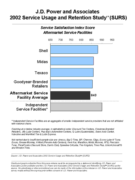 Shell ranks highest among major aftermarket service facilities, with customers particularly appreciating the ease into and out of service as well as the treatment provided by the service advisor. Independent facilities, as a whole, also tend to receive high ratings from their customers, due mainly to the direct interaction with service operators/technicians and the speed of service.