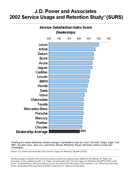 Westlake Village, Calif.— Despite the fact that automotive dealerships have at least three years of warranty experience to develop relationships with their customers, the majority of consumers visit non-dealer service centers for post-warranty repairs and service, according to the J.D. Power and Associates 2002 Service Usage and Retention StudySM (SURS) released today.