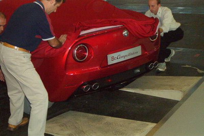 When our team strolled around the Frankfurt Exhibition Halls we stumbled into a group of workers who were busy pushing a suspiciously low-built Alfa Romeo. It turned out to be the 8C Competizione, which will be unveiled tomorrow.