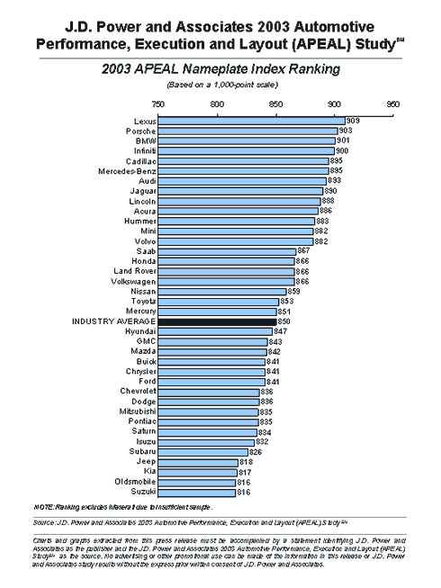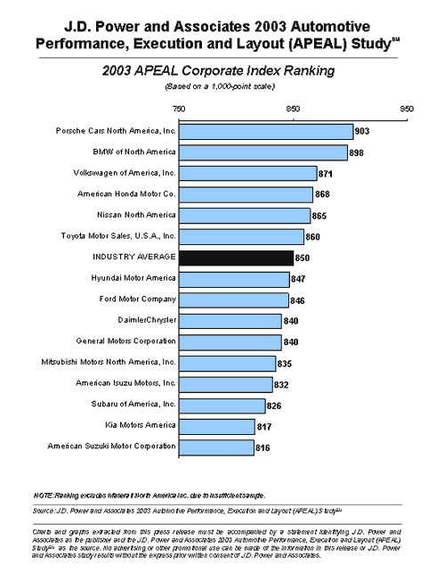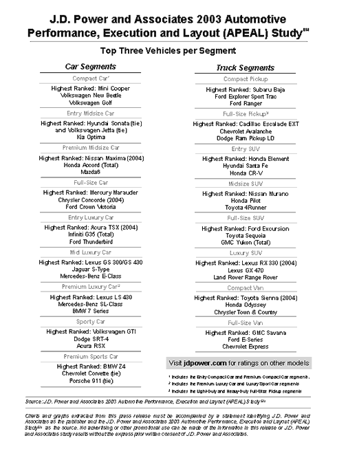 The 2003 APEAL Study is based on responses from 102,975 new-vehicle owners. The study, now in its eighth year, is based on eight specific categories of vehicle performance and design that identify what consumers like and dislike about their new vehicles during the first 90 days of ownership. The areas are: engine/transmission; ride, handling and braking; comfort/convenience; seats; cockpit/instrument panel; heating, ventilation and cooling; sound system; and styling/exterior.
