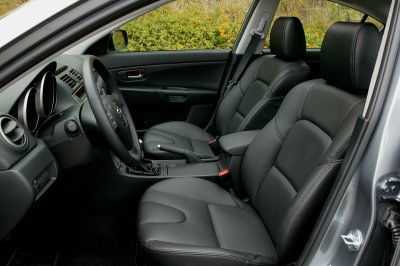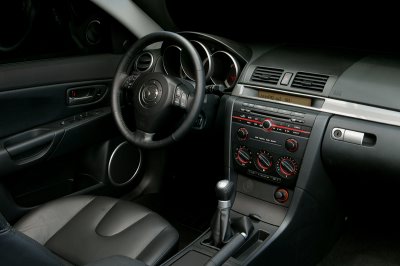 COMFORT: The Mazda3 is friendly - a ``Hello!'' message is shown in the audio system display when you start the car. Like the Protege5 before, the Mazda3 5-door's interior is styled and equipped above it's modest price point. The new 3 is a more mature car, with a notable lack of silvery plastic trim and slippery imitation race pedals. Bright trim is found on the instrument and outside vent bezels, and a swatch of imitation carbon fiber adds interest to the center of the instrument panel. This is a car for driving, and the driver is treated to a steering wheel with a thick leather rim that adjusts, manually, for both reach and tilt and a comfortable and supportive sport seat that has adjustable cushion height. The leather-covered shift knob is placed well, and the red-backlit instruments are easy to read. Cruise and auxiliary climate controls are found on the steering wheel, with the main audio and climate controls in the center stack. There is practicality with sport, as storage areas include a huge glovebox, door pockets with bottle holders, and a two-level console box for front passengers. The rear seat is contoured for two, and two adults can fit easily if they are under six feet tall. There is space, and a safety belt, for a third rear passenger, but, as is typical for any car this size, that is a short-term position. The rear seat is split 60/40 for cargo when needed - and at those times the rear doors are wonderful for positioning items, even when the cargo is inserted from the rear. A standard cargo shade hides anything in the rear when the rear seat is up, and it can be removed when necessary. There are tiedowns in the cargo area, and a small amount of storage space under the floor.
