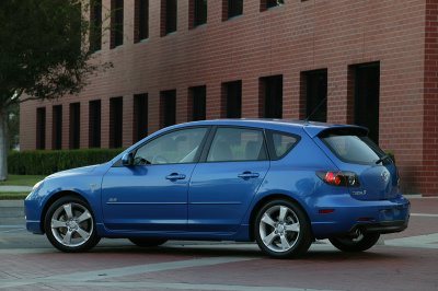 APPEARANCE: A sporty car should look sporty, and the Mazda3 hides nothing of its character in its skin. It shows all of the latest styling trends from Mazda, with a healthy dose of Mazda6 in the sculpted hood and more than a hint of RX8 in the front face. As on the Mazda6 and RX8, sharply-sculpted character lines radiate back from the grille (in this case a body-colored version of the Mazda five-point design) to form a power dome hood. The plastic-faired headlight clusters are between the 3's two relatives in shape, but the lower fascia, with a large mesh-covered intake flanked by faux brake scoops with projector-beam foglamps, has a marked similarity to the front of the RX8. The hood line continues to the base of the windshield to form a strong shoulder line, and top of the each lower, wider front fenders creates a line that flows back to the complementarily-shaped blistered rear fender for a strong, purposeful look. Seventeen-inch wheels with low-profile performance tires fill the wheel arches, and plastic trim garnishes the rocker panels. Although the Mazda3 5-door has a longer wheelbase than the old Protege5, and is longer, its beefier proportions give it a look that is more hatchback than wagon. At the rear is a large compound-curved hatch and clear-covered taillights that echo the headlight shape. A small spoiler is found atop the trailing edge of the roof.