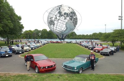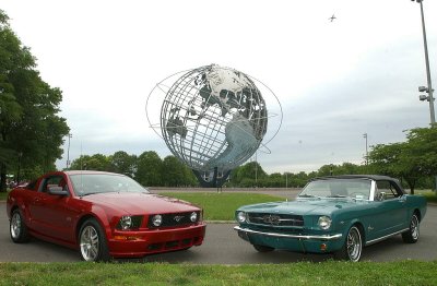 FLUSHING, NEW YORK May 31, 2004; On the site of the 1964-'65 World's Fair, where the Unisphere still stands, the original Ford Mustang (R), which made its debut there, meets the 2005 40th Anniversary Mustang. The event was a car show attended by 80 vintage Mustang enthusiasts and their cars, which are parked behind it. Photo by Richard L. Harbus for the Ford Motor Company