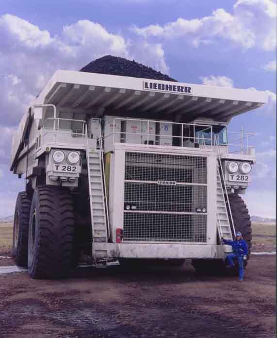 To put its size into perspective, the Liebherr T282 B is nearly the size of a two-story, 251- to 279-square meter (2,700- to 3,000-square-foot) house. It debuted to more than 400,000 attendees at the Bauma 2004 construction and mining equipment exhibit in Munich, Germany, and will make its United States debut in Las Vegas at the MINExpo Show in September.