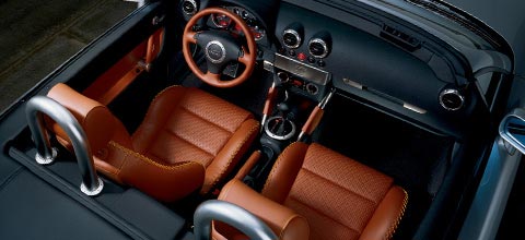 COMFORT: If the TT's external styling could be a German Art Deco era concept of a 21st-Century sports car, its interior is purely contemporary. It's comfortable, too. The manually-adjustable seats support the driver and passenger well, even during enthusiastic driving. You sit low, but visibility is great with the top down, and good for a convertible with it up. The power-operated top goes up or down quickly, with manual latching and unlatching. Aluminum trim brightens the interior, without causing glare. The dimpled climate control vents are particularly noteworthy for their clean design and ease of use. Compared to the coupe, space is at a premium in the TT cabrio, but such is the price paid for the open-air experience. A standard clear, moveable rear windbreak between the roll bars keeps backdraft at bay at highway speeds.