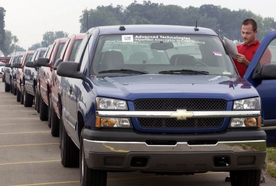 General Motors' Chevrolet Silverado gasoline-electric hybrid pickup trucks, which double as mobile power generators, will get their first real world test helping hurricane victims in Florida. Kevin Ladkey of Manheim's Detroit Auto Auction in Romulus, MI, checks the paperwork prior to the first shipment, Wed. August 18, 2004. GM plans to send between 40 and 50 of the trucks to the hardest hit areas of Florida. Each truck is equipped with four 120-volt outlets, which can be used to power refrigerators, lights, drills, saws, computers and other electrical appliances that use standard household voltage. (General Motors/Joe Polimeni)