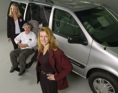 General Motors engineers Kelly Walro (l to r), Cido Porcel and Michelle Burrows pose with a Sit-N-Lift equipped 2004 Chevrolet Venture Thursday, August 26, 2004, in Pontiac, Mich. The trio developed the Sit-N-Lift seat system that provides convenient access to the right-hand second-row seating area. Operated by a handheld remote control, the power bucket seat rotates, then extends out of the vehicle and lowers for easy entry and exit. This feature allows a wide range of people to stay as independent as possible - and GM is the only automotive manufacturer in the U.S. to offer a fully motorized, rotating lift-and-lower passenger seat. (General Motors/John F. Martin)
