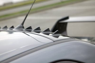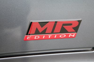 At the trailing edge of the MR Edition's roof, a vortex generator creates small vortices that reduce drag and increase the down force generated by the rear-deck spoiler. The generator vanes are finished in the same dark gray as the outer panels of the spoiler.