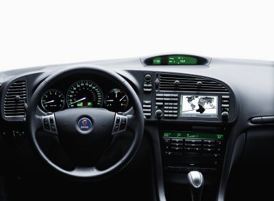 Saab retains the transmission hump-mounted ignition key slot. Also on the transmission hump, the handbrake is nicely integrated into the center console.