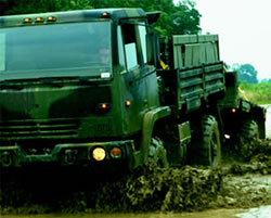 First it was the Jeep, then the Hummer, now consumers have the opportunity to own an even bigger military conversion vehicle. Weighing in at just over 13,000 pounds, the 275 horsepower Bad Boy HMT retains the features of its military pedigree. It is 21 feet long, 10 feet tall and 8 feet wide, and has ample room for three adult passengers in the cab, situated over the engine to offer superior vision and vehicle balance. The all-wheel drive configuration can safely run at freeway speeds, carrying a 5,000-pound payload. Off-road, its military specification delivers a 22-inch ground clearance and the capability to climb grades as steep as 60 percent with its load. It can even operate in up to 60 inches of water. The truck comes equipped with a Central Tire Inflation System that has settings for off road, mud and snow. The tire system can also keep the tire inflated even if it has a hole the size of a quarter in the sidewall. Equipped with the standard 58-gallon tank for diesel fuel, the truck can carry passengers 400+ miles, depending upon the payload.