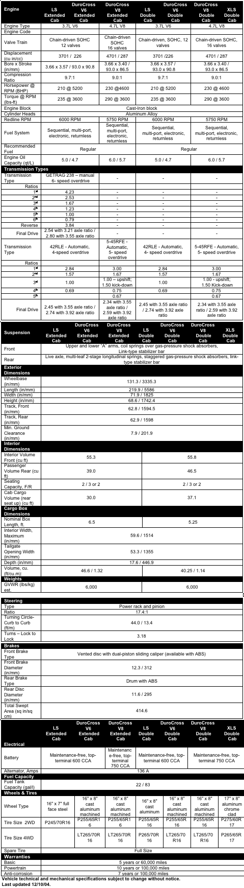 Raider LS Double Cab is available with Mitsubishi's 3.7-liter V6 engine and DuroCross Double Cabs come with either the V6 or largest-in-class 4.7-liter V8. More than 100 cubic feet of interior space in all Raider Double Cab models provides comfortable room for up to five people and gear. Both Durocross Double Cab models can be equipped with a Sound Package featuring a premium audio system with overhead trip computer, AM/FM/six-disc CD changer, Sirius(R) satellite radio and steering wheel audio controls. A trailer tow package is standard on DuroCross V8 models.