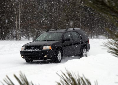 RIDE AND HANDLING: Although the wheelbase and track are the same, and most chassis stampings are shared, the Freestyle is about 300 lbs heavier than an equivalent Five Hundred because of its larger body and interior. To compensate, the Freestyle's fully-independent MacPherson strut front, multilink rear suspension is tuned more firmly. It's not all that firm, and is quite comfortable. It is also an improvement over the Five Hundred from a cornering and fun-to-drive standpoint, and it is quiet on the highway. It may not be a sport wagon, but the Freestyle is no ponderous sport-utility, either. The available all-wheel-drive system, with which my test car was equipped, normally operates in front-wheel drive mode, for familiar driving characteristics. When front wheelslip is detected, the Haldex electro-hydraulic limited-slip center coupling directs power to the rear wheels. The traction control system takes care of side-to-side power distribution. This is not an off-road 4WD system, but is meant for all-weather traction on civilized surfaces.
