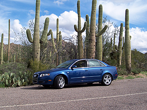Recently, the whole west coast has been experiencing heavier than normal rainfall. The desert was at its lush-est, as was the driving experience. The new A4 does not ride or drive like a small car; it has the feel and comfort of something much larger. In much the same way that the new 2005 Audi A6 could be mistaken for an A8, the A4 could be favorably compared to the great feel and comfort of a previous A6. To think that this is Audi’s low end sedan is amazing, because it’s as far from low-end as you could get. During the morning’s pre-drive product presentation the sedan’s cargo carrying capacity was described as being able to carry two full sized bags of golf clubs. After examining the truck space, I’d say the car could carry a full sized golf bag for each of its 4 or 5 occupants, plus at least one caddy: it’s cavernous.