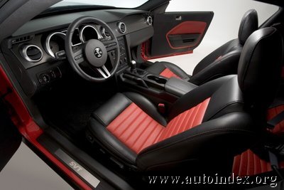 The interior is completely wrapped in ebony black leather, including the top of the dash, door panels and center arm rest. Also wrapped in ebony leather are the shift lever, shift boot and parking-brake handle. SVT Red leather seating surfaces and door panel inserts provide a marked contrast to the rest of the leather-trimmed cabin, surrounding the performance enthusiast with luxury and comfort. Snake logos embroidered into the seat backs finish the package.
