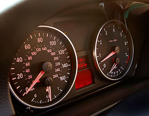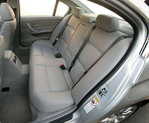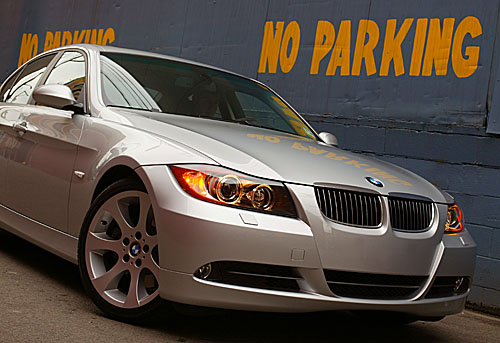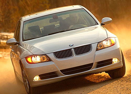 Inside are manual seats (325i) or memory power seats (330i) or Sport seats for either model with the Sport Package. Burl Walnut is the standard trim, with Natural Poplar or Aluminum a no-cost option. The dash is a single piece, with a single eyebrow over the twin gauge cluster. Of course the gauges are large and easy to read. If you purchase the navigation system for $2,000, it includes voice recognition and alters the dash, adding a second brow. iDrive, the control for all entertainment and communication has been improved; now you can get to the main menu with a single button. All models have improved audio systems, whether the premium Logic 7 system from Harmon Kardon in the 330i or upgradeable 330-Watt 10-speaker system standard in 325i. Either offers MP3 CD playback, and BMW offers an input jack on the dash so you can easily connect your iPod to the system.