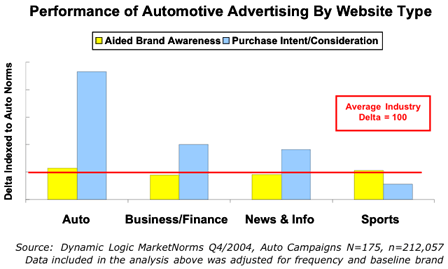Recent analysis of Dynamic Logic's MarketNorms® (Q4/2004) shows that auto ads can build Brand Awareness very well on just about any type of website, but can dramatically increase Purchase Intent when running on auto sites.