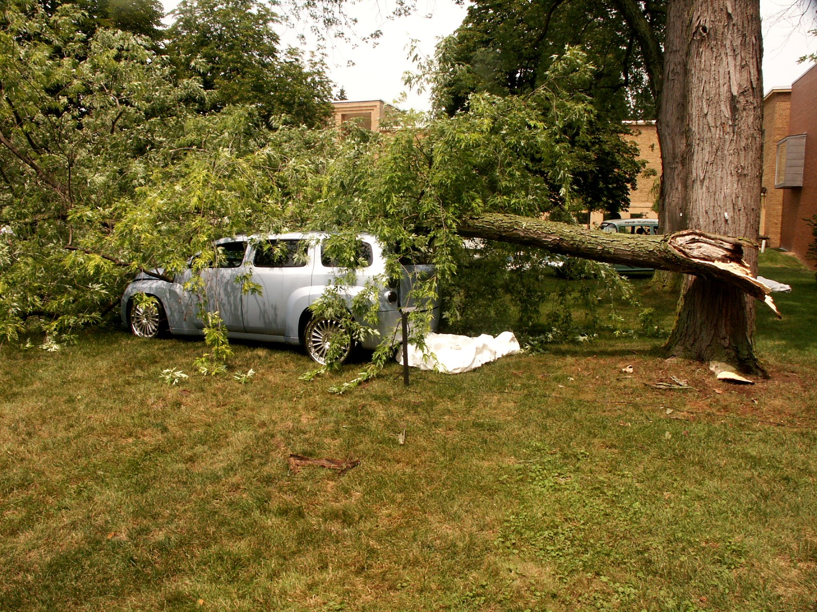 Even though the sun came out and a nice breeze mitigated the steaming heat all would not be smooth for the afternoon. We were sitting in the VIP tent beside Nemo’s Fountain cooling off with a cold glass of Chardonnay. Gary Cowger, GM Group VP and honorary chairman for the Concours was sitting in the corner awaiting a call from Jay Leno regarding the display of some of the latter’s cars when a loud crackling noise, almost like rapid gun fire, split the air grabbing our attention. We quickly looked across the fountain from where the sound came and saw the lesser half of a large silver maple tree break away and come down squarely on top of a new Chevy HHR concept car in the GM display. A fellow attending the car suffered a glancing blow from part of the large limb and he went down. The ambulance came and hauled him away. We understand he’s OK. But the poor HHR will need some major repair. When I went over to photograph the mess I thought about ‘loading’ a car’s suspension when we’re photographing cornering action. The HHR’s suspension was fully loaded standing still under the weight of that mighty maple.