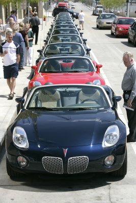 A line of 2006 Pontiac Solstice vehicles line the street outside the Wintergarden at the GM Renaissance Center prior to a ceremony to present the first Solstice Friday, August 5, 2005 in Detroit. Hundreds of GM employees and more than 100 owners of the First 1,000 Pontiac Solstice owners group, representing 30 states attended the event.