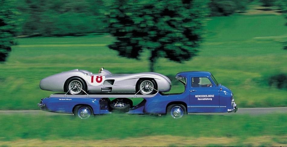 Weighing nearly 7,000 pounds with a racecar on its bed, the Mercedes-Benz transporter was capable of achieving high speeds. "Max. Speed 105 mph" was painted on its rear fenders to answer the frequently asked question -- "How fast will it go?"