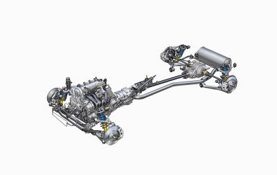 The transmissions channel torque to an independent rearend that features a 3.91:1 axle ratio. The gears are housed in a rear axle derived from the Cadillac CTS, which was chosen for its excellent performance characteristics and high torque capability. A limited-slip rear differential is available. It uses a pre-loaded, friction clutch-type design and divides power equally between both rear wheels during normal driving conditions, but in low-traction conditions, the differential transfer torque to the wheel with better grip.