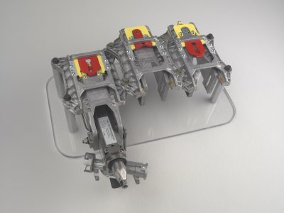 The “Adaptive Stroking Steering Column” is very cool, and more than a little weird. The photo shows three possibilities for this device, which permits the steering wheel to move forward as much as 4” (100 mm) to absorb crash energy. By deforming as energy is absorbed (your body pushing into the airbag and steering column—like a stunt man falling onto a stack of cardboard boxes,) the “curl strap” acts as a force absorber.