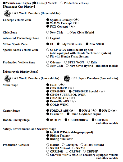 October 5, 2005 -- Torrance, Calif. -- Honda Motor Co., Ltd. today announced the lineup of vehicles to be displayed at the 39th Tokyo Motor Show (sponsored by the Japan Automobile Manufacturers Association), to be held from Saturday, October 22 to Sunday, November 6, 2005, at Makuhari Messe in Chiba, Japan.