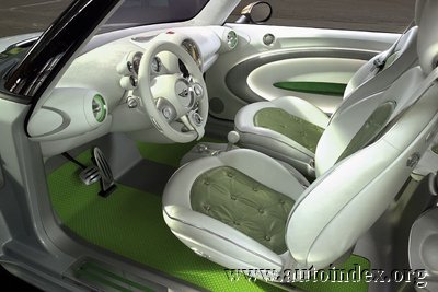 Leather, Brass Look and Aluminium as the Main Materials. White leather inside the car enhances the impression of modern style, conveying a sophisticated ambience and accentuating the clear lines of MINI Concept Tokyo, with green surfaces and brass highlights such as the seat upholstery in Chesterfield design standing out elegantly.