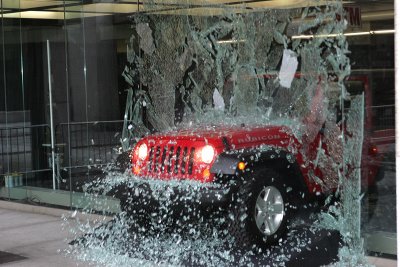 After breaking out of a cage and appearing onstage, the all-new 2007 Jeep Wrangler drove offstage, through the auto show display area, into the Cobo Center lobby and smashed through the front window. The all-new Wrangler then climbed down a flight of Cobo Center stairs, proceeded up Washington Avenue and scaled the outdoor stairs at Detroit's Pontchartrain Hotel, before confidently climbing Jeep Mountain.