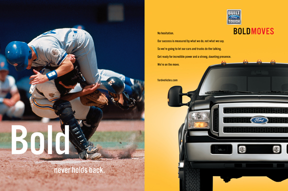 Bold Moves Ford's Bold Moves initiative will cover both the brand and individual Ford nameplates, and it will provide a new, common creative platform for Internet, broadcast and print advertising at the national, regional and local level.