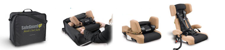 The first ever hybrid car seat, the SafeGuard Go, combines the convenience and portability of a backless booster with the safety and security of a five-point harness seat. It is lightweight (under ten pounds) and folds neatly away into a compact travel bag for easy transport and storage. In addition to the seat's safety and transport advantages, the SafeGuard Go can be installed properly in less than one minute. The SafeGuard Go takes the headache out of long-distance travel since it is small enough to carry on an airplane and saves the cost and hassle of renting child car seats.