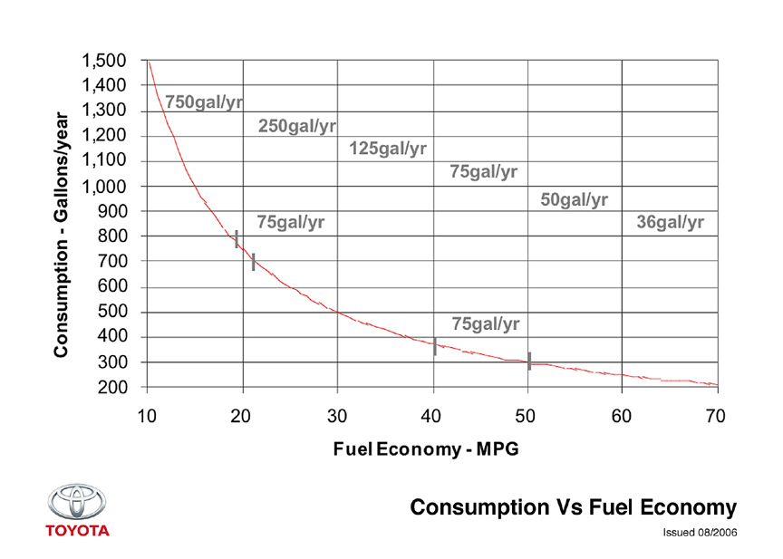 15,000miles / 50mpg = 300gal 15,000miles / 21mpg = 714gal