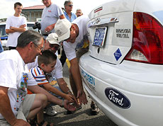 ![]() Onlookers test the water vapor only exhaust from Ford's Hydrogen Fuel Cell Vehicle at Detroit's "Dream Cruise" |