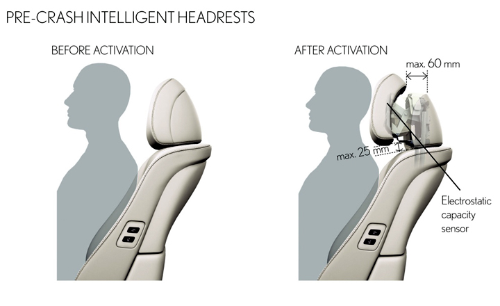 If a collision is calculated to be unavoidable, the system activates the front seat Pre-Crash Intelligent Headrests. These move up to 60mm forwards and 35 mm upwards to cushion the head in anticipation of an impact, greatly reducing the risk of whiplash injury. The headrests are fitted with a sensor that measures the distance between the passenger’s head and the headrest itself, so there is no risk of the emergency adjustment itself causing substantial contact. The system does not operate if the seat is unoccupied.