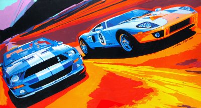 Camilo Pardo Mural: Two performance icons, the 2007 Ford Shelby GT500 and the 2006 Ford GT were painted on a 15 x 30 foot canvas by Camilo Pardo, chief designer of the Ford GT and accomplished artist to support a project with Winding Road magazine for their September cover. Photo credits: James Morse-Winding Road Magazine. (08/30/06)
