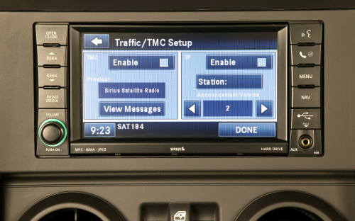 Chrysler Group’s first real-time traffic will utilize SIRIUS Satellite Radio broadcast capabilities to provide subscribers nationwide (where available) with updated traffic information. Offered as a premium service of the SIRIUS Satellite Radio subscription, SIRIUS traffic provides drivers with regularly updated traffic information such as accidents, scheduled road closings and traffic flow to help them select the best available route. The traffic information is integrated within the navigation system and displayed as an overlay on the navigation screen, thus combining navigation with traffic to offer guidance to the driver. This function will save customers frustration whether on their daily commutes or when traveling on unfamiliar roads.