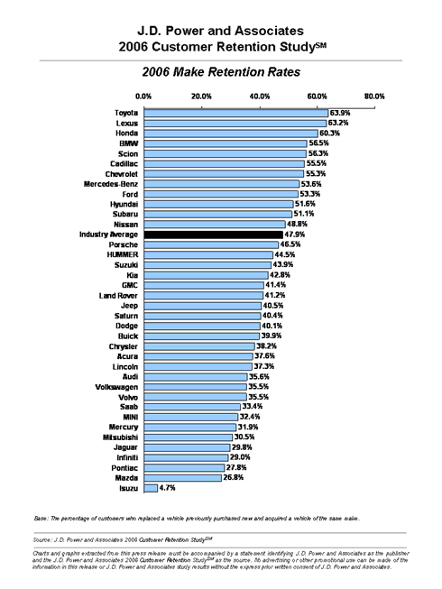 Now in its fourth year, the study measures the percentage of new-vehicle buyers and lessees who replace a previously purchased new vehicle with another from the same nameplate. As a whole, the industry registers a slight decline in customer retention, falling to 47.9 percent, from 49.6 percent in 2005.